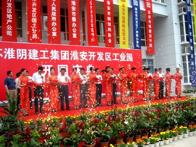 7月16日,集团开发区工业园区锣鼓喧天、彩旗飞扬。巨大的圆形拱门,色彩鲜艳的空中气球,鲜花,礼花,将工业园妆扮一新,园区呈现出一派喜气洋洋的节日气氛。 上午9时48分,淮建集团开发区工业园开园庆典正式开始,庆典由胡从亮总经理主持。许金华董事长首先代表集团全体员工向各位来宾致欢迎辞,并简要介绍了淮建集团50年的发展历程、近几年企业的生产经营情况以及淮建集团工业园的建设概况,他对各位领导及各位来宾对淮建集团的长期关注以及集团工业园建设的大力支持表示由衷的感谢;市经济开发区管委会周毅主任作了热情洋溢的讲话,他代表开发区管委会祝淮建集团“今日吉祥开园,明朝大富启源”,同时祝各位来宾事业兴旺、吉祥如意,祝淮建集团各位员工身体健康、合家欢乐;市政府刘晓录副秘书长到会宣布淮建集团开发区工业园隆重开园。庆典现场顿时鼓乐齐鸣、礼花飞扬,数千只五彩缤纷的气球腾空而起,十六响礼炮隆隆作响,预示着集团工业园宏图大展、实现新的跨越!