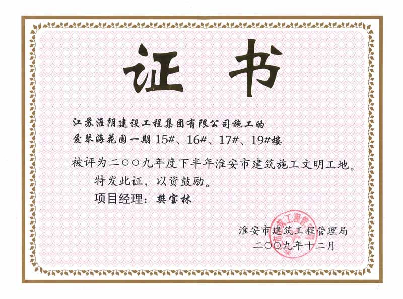 2009年市文明工地爱情海花园一期15、16、17、19号楼(樊宝