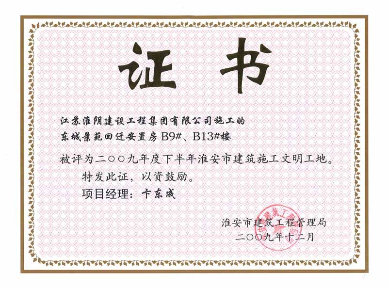 2009年市文明工地东城景苑回迁安置房B9#、B13#楼(卞东成